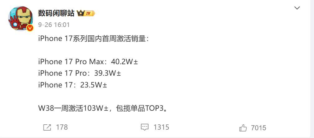 苹果iPhone17系列首销火爆,那么国内到底卖出了多少台呢?根据博主“数码闲聊站”的数据,W38周苹果iPhone17系列首周激活量超100万,其中ProMax激活量约为40.2W,Pro激活量约为39.3万,标准版激活约为23.5万,总体来说,还是Pro版更畅销,Pro和ProMax总激活量接近100万,占比近八成,从增长率方面来看,iPhone17标准版对比上一代几乎翻倍,其他机型也有增长,但增速不及标准版。