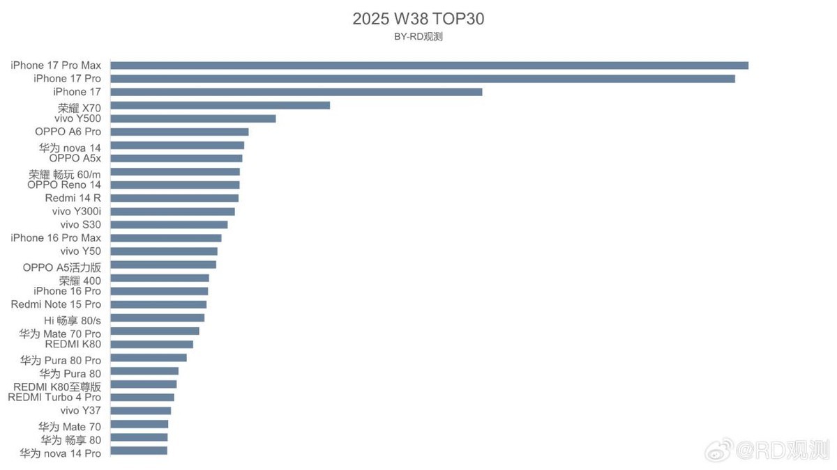 2025年第38周国内手机销量排名出炉,这一周苹果iPhone17系列正式首销,作为近几年来改动最大的一款iPhone手机,苹果17系列首销表现出色。根据博主“RD观测”提供数据,iPhone17ProMax排名第一,iPhone17Pro排名第二,iPhone17排名第三,苹果再次包揽前三。