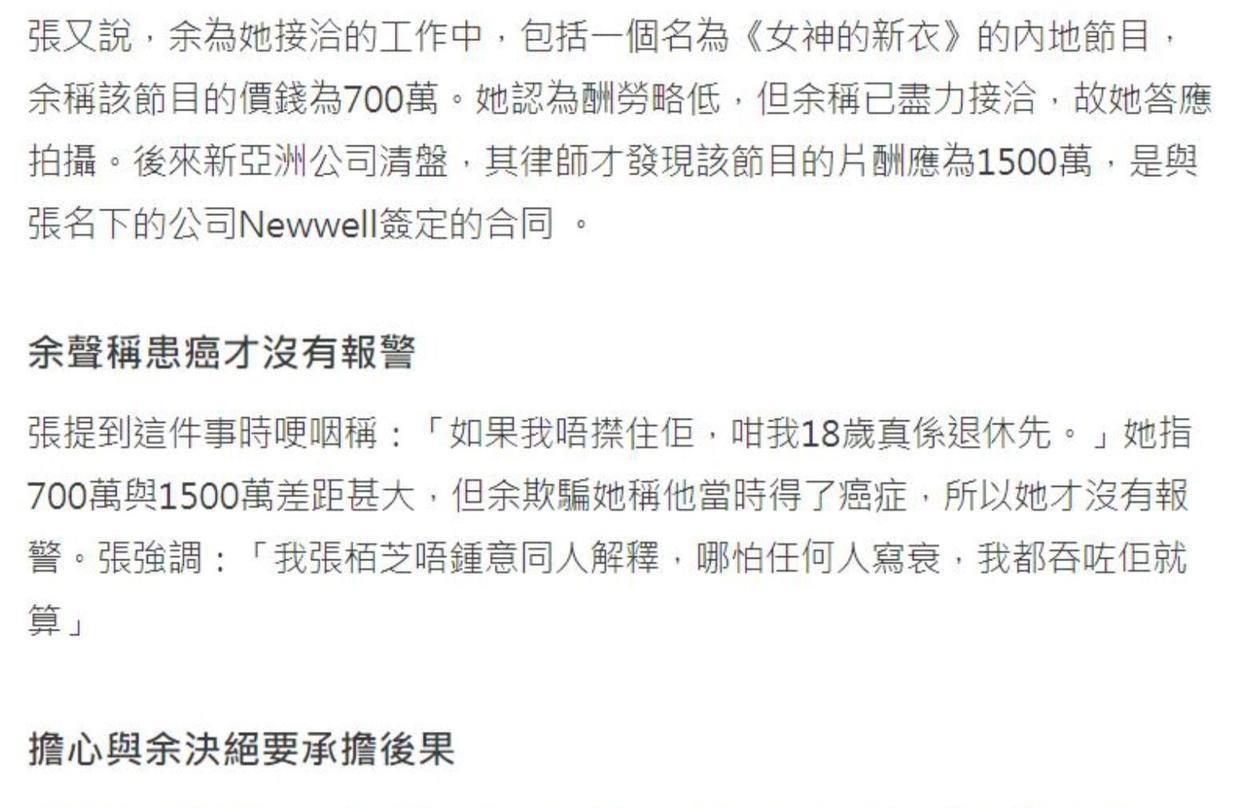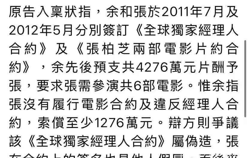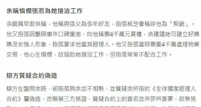 张柏芝说,她和余之前根本没打过交道,也不是她父亲的朋友,更不存在“干爹”这种关系,两人就是纯粹的生意合作。她还特别强调,那份当年的合同不是她自己签的,另外也提到余所在的公司早就倒闭清算了,他也早就跑掉了,那家公司已经不存在了,这份合同也无法继续执行。