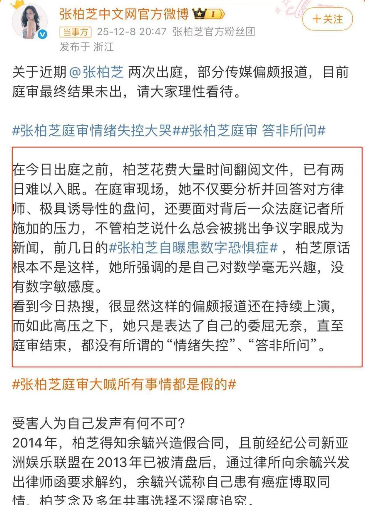 她的官网说那些报道挺偏激的,这种偏颇还在不断上演。在这么大的压力下,张柏芝只是吐露了自己的一些委屈和无奈。直到庭审结束,张柏芝并没有表现出所谓的“情绪失控”或者“答非所问”的状况。
