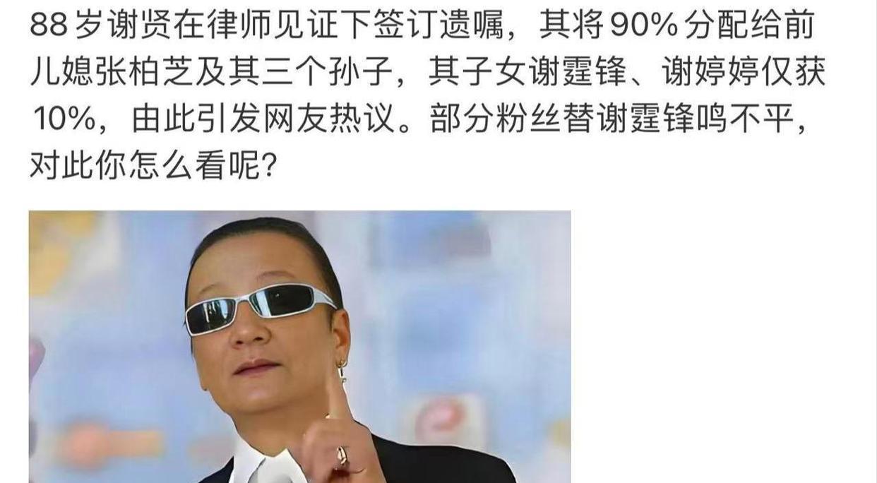 如果不出手帮忙,谢霆锋那一声沉默,倒让人联想到谢贤当时的一个动作。有传闻称,之前香港媒体爆料了谢贤的遗嘱,当时这消息闹得挺大,据说谢贤已经把遗产划分好了,打算把90%的财产留给两个孙子。