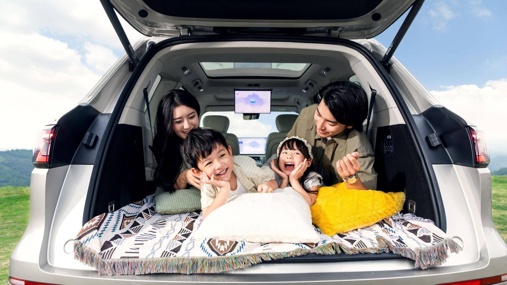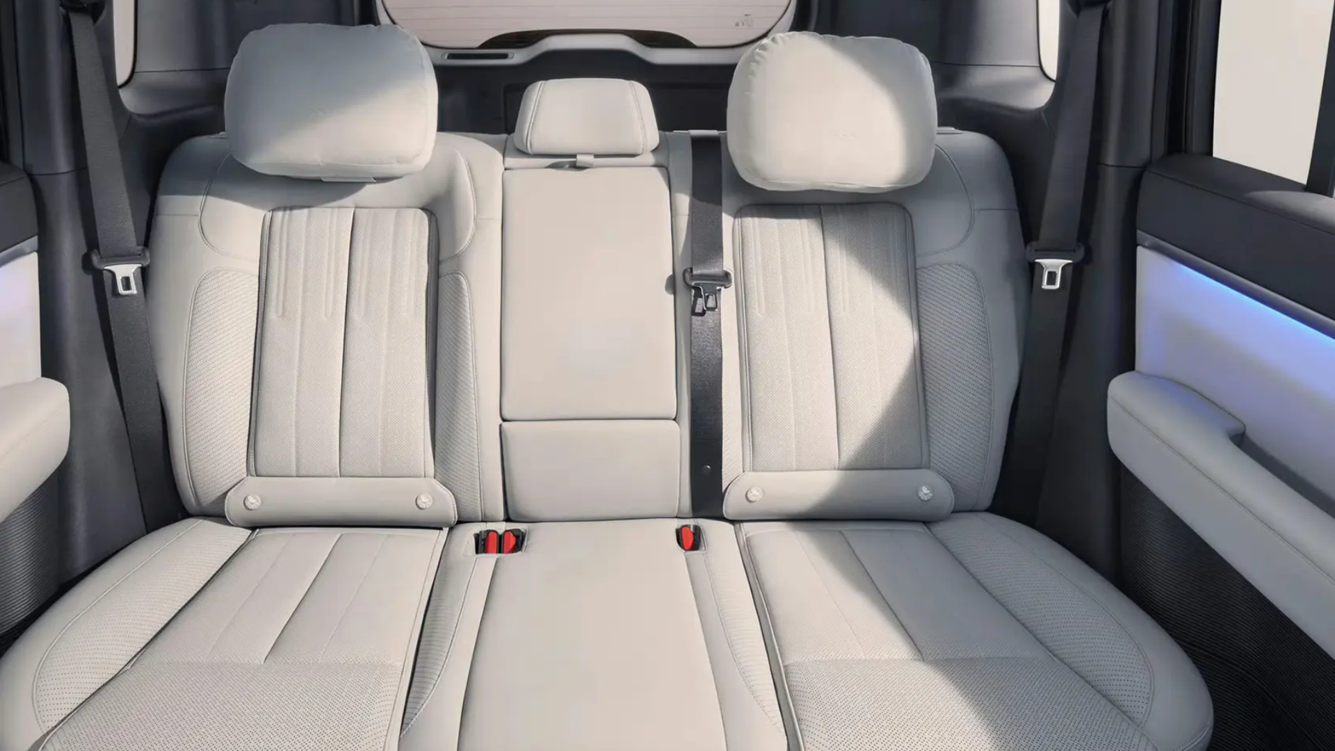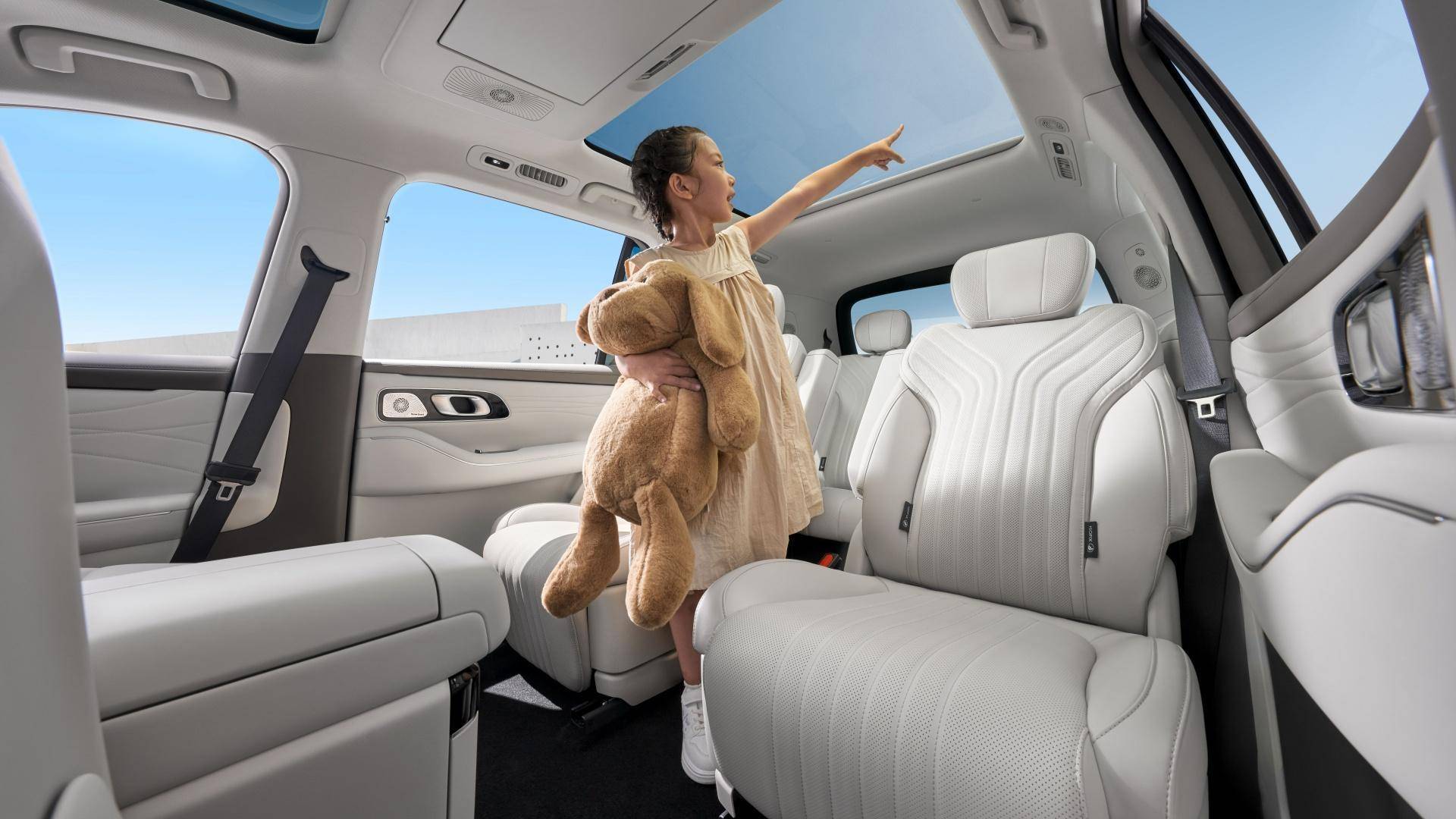 先看座位布局:银河 M9是2+2+2六座,这可不是简单多两个座位,而是解决了家庭出行的“核心痛点”。日常通勤时,第三排可以放倒,秒变“大五座”,后备厢能塞下婴儿车 + 购物袋;周末带老人孩子出门,6个座位刚好坐下“一家三代”,第二排独立座椅带扶手,老人坐久了不腰酸,孩子在中间过道走动也方便;要是长途自驾,第三排坐两个成年人也不挤 —— 它的短前悬长轴距设计,硬是挤出了5.2㎡同级最大车内面积,得房率高达88.3%,第三排腿部空间够舒展,不是“应急小板凳”。