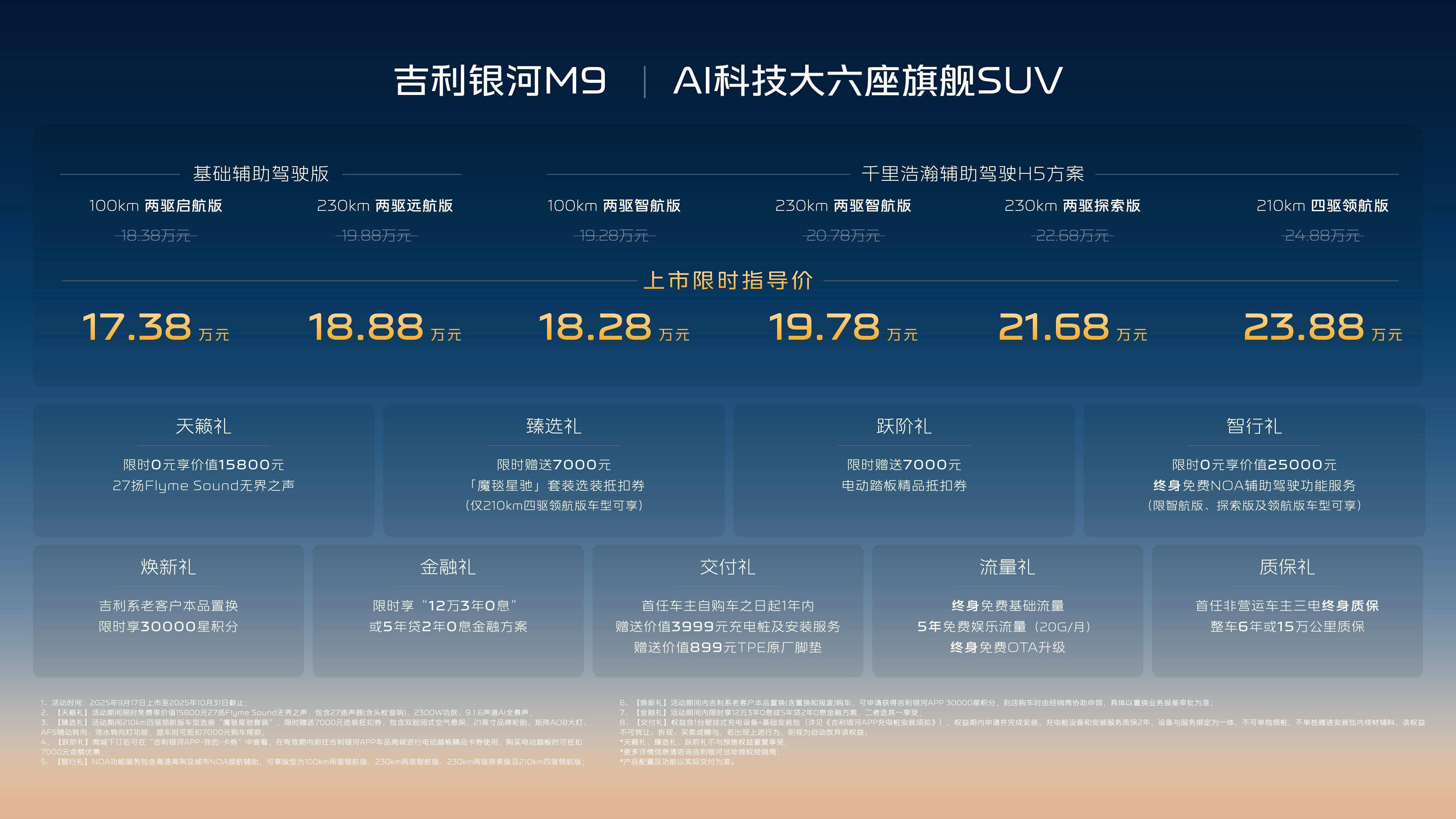 银河 M9是吉利银河旗下的中大型6座SUV,上市限时指导价17.38万元 - 23.88万元,直接把“6座、大空间、高舒适”打在公屏上。不管是工作日送娃上学、下班顺路买菜,周末带老人逛公园,还是节假日长途返乡,它的每一处设计都在适配“全家需求”。就像家里的暖男,不张扬但事事考虑周全,知道你需要的是“省心、舒服、够用”。